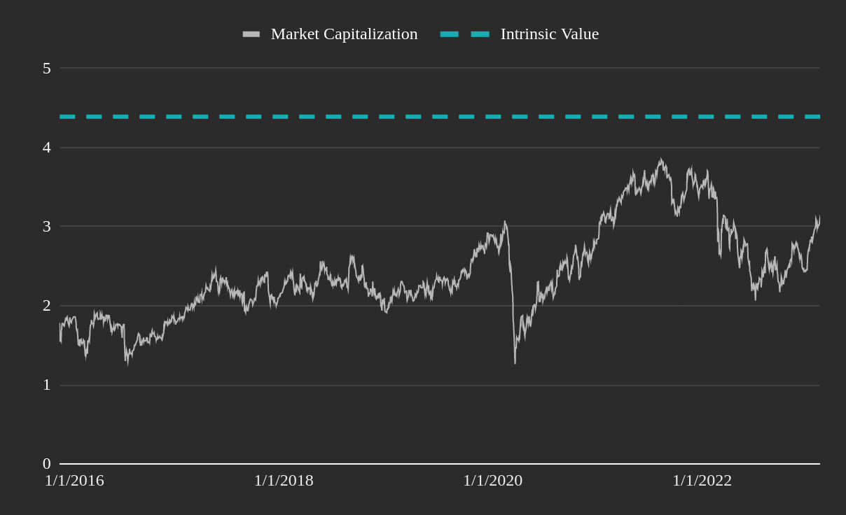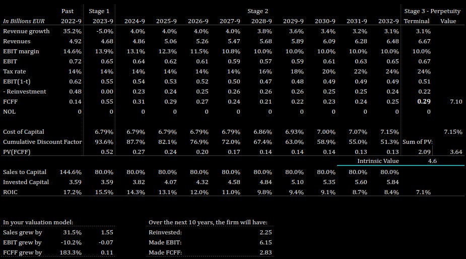 Given our future projections, and a cost of capital of 7%, we derive an intrinsic value of €4.6 billion or €42.6 per share, implying that the stock is some 33% undervalued.